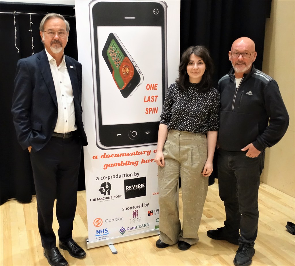 Panel members at Inverkip ( left to right), Ronnie Cowan, Member of Parliament for Inverclyde; Georgina Charlton, Scotland Reducing Gambling Harm at the Alliance for Health and Social Care; Martin Paterson, Director of The Machine Zone Community Interest Company, Executive Producer of the film and film participant.